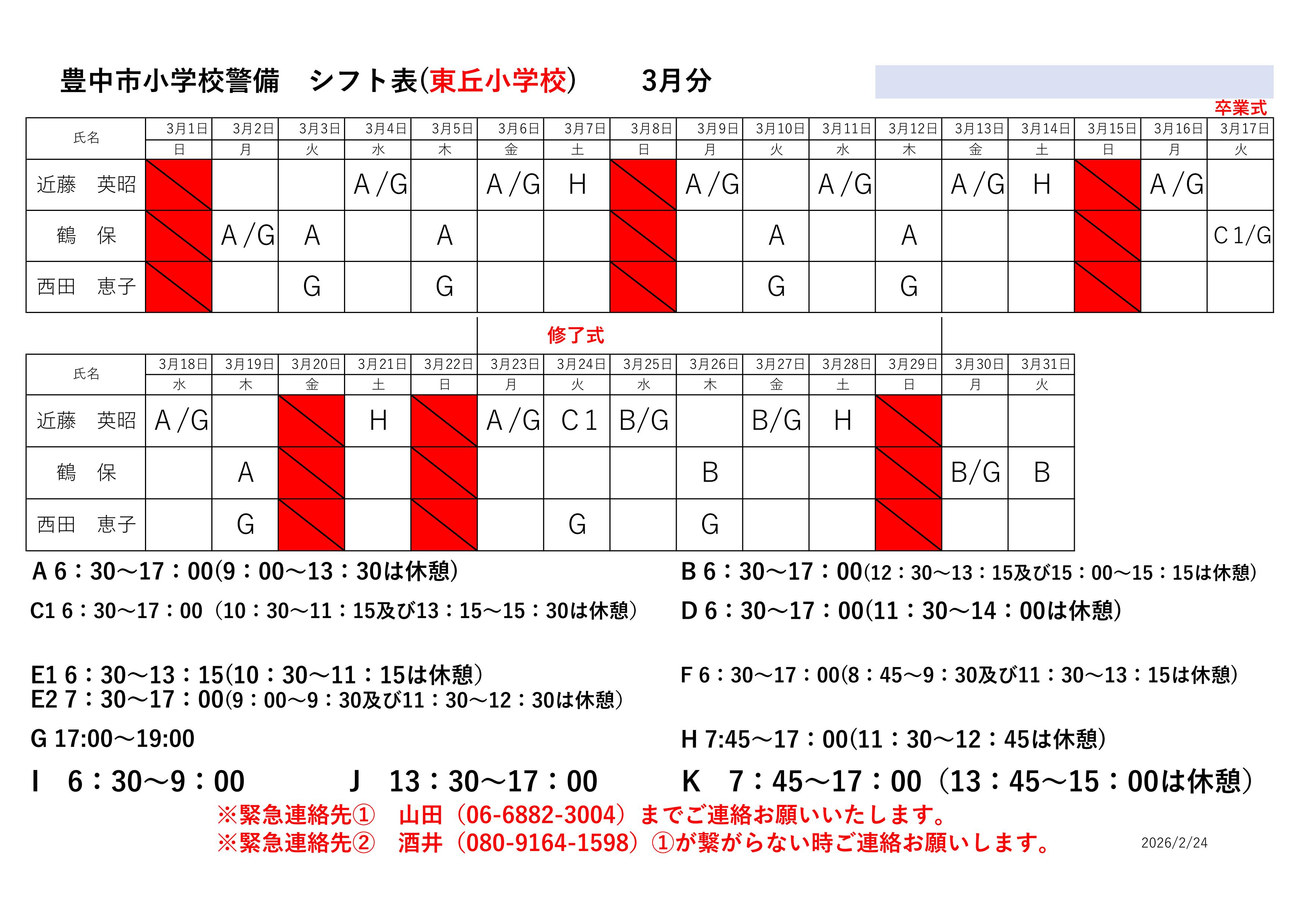 最新のシフト表は下記をご確認ください。