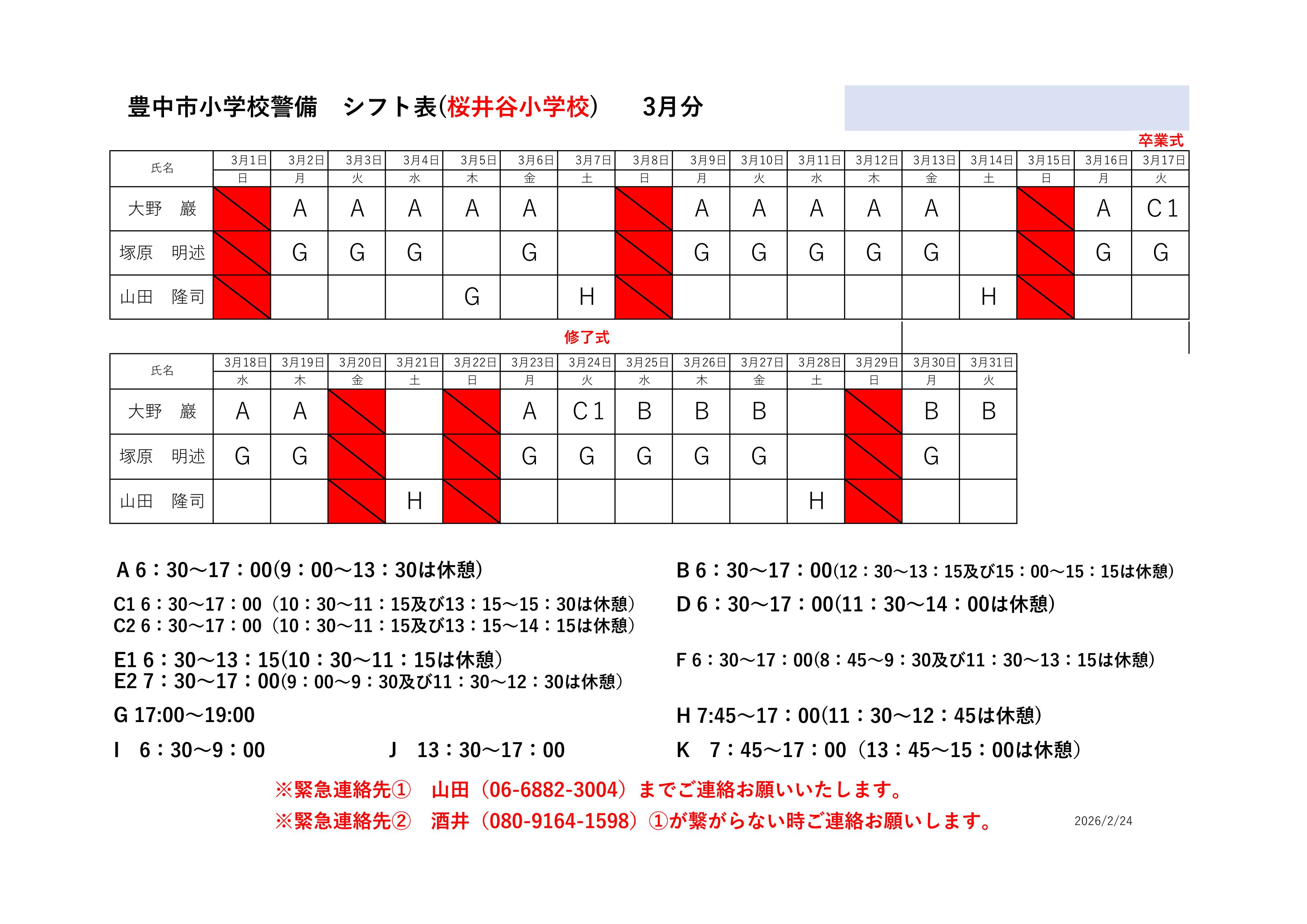最新のシフト表は下記をご確認ください。