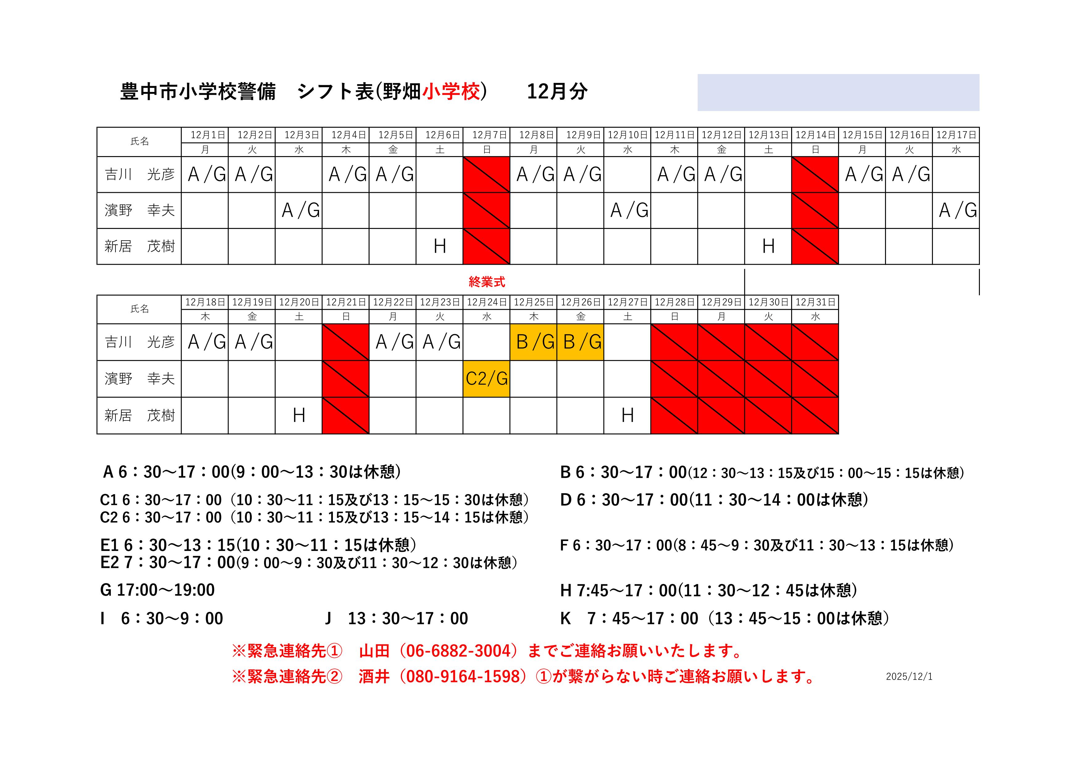最新のシフト表は下記をご確認ください。