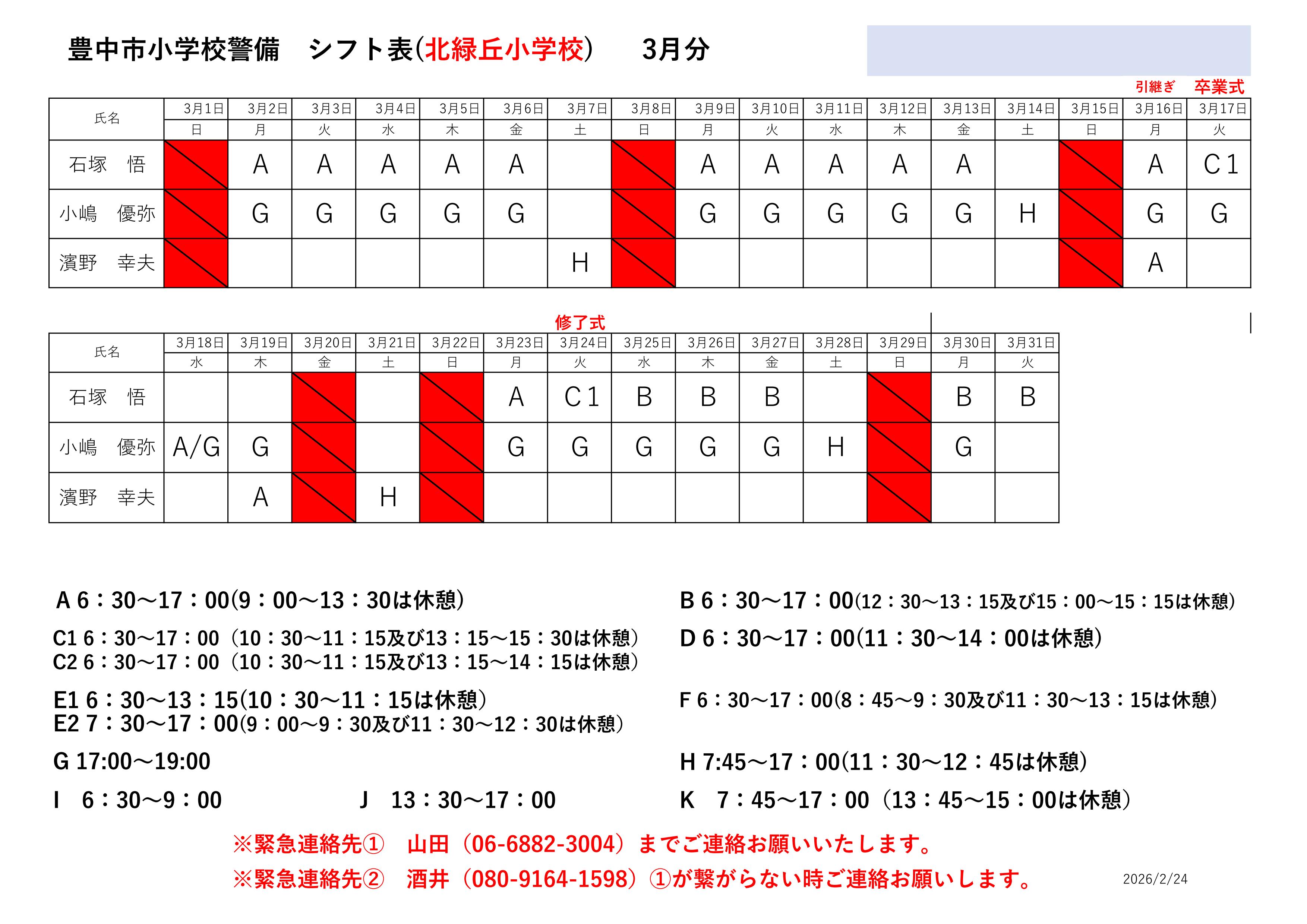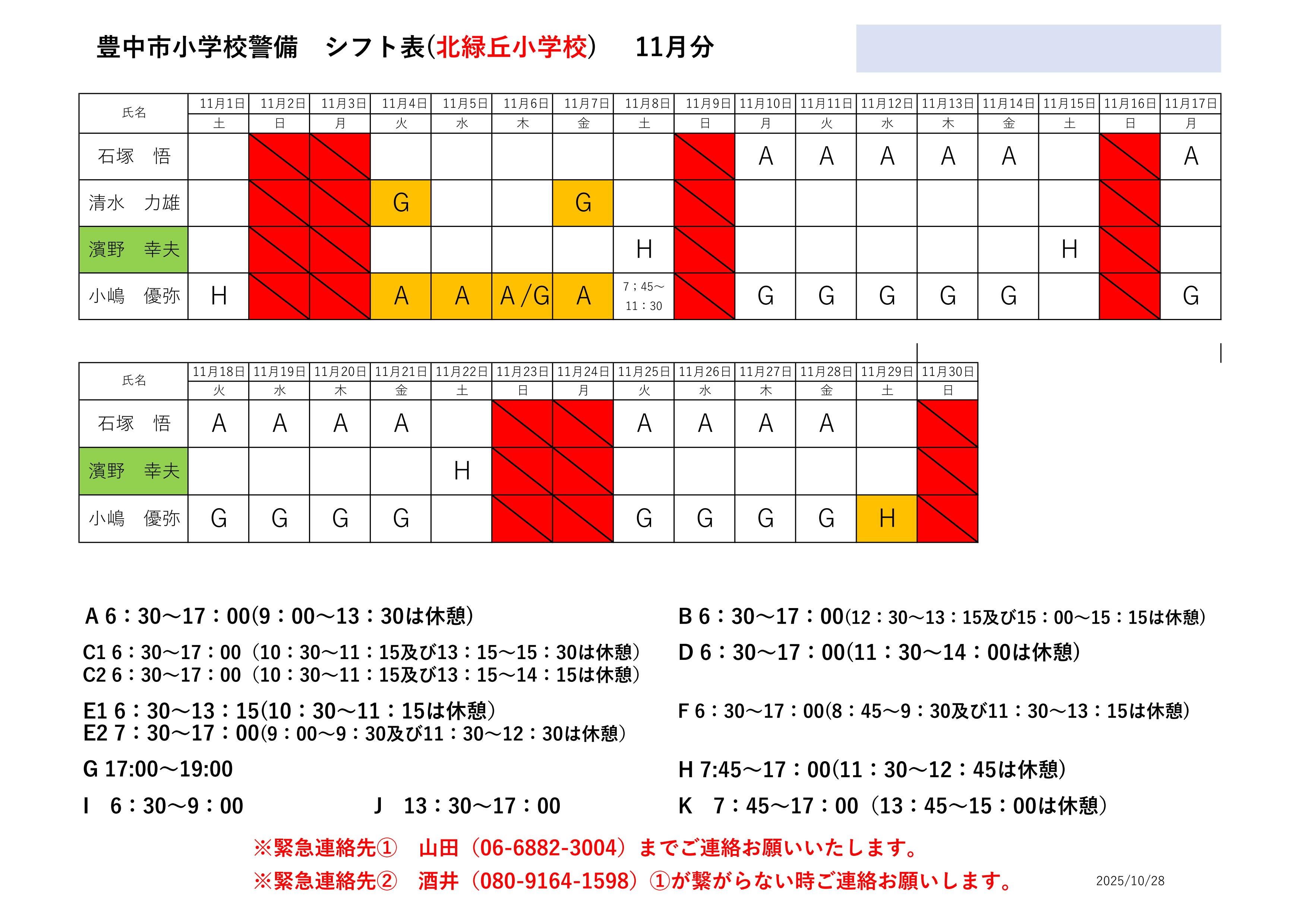 最新のシフト表は下記をご確認ください。